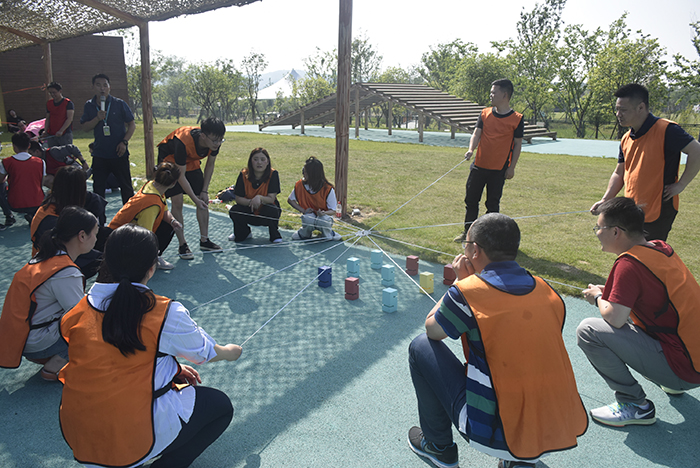 饭后大家在露营谷做了户外拓展。游戏“齐心协力”考验的是团队领导的组织能力、团队成员的协调能力与合作能力;